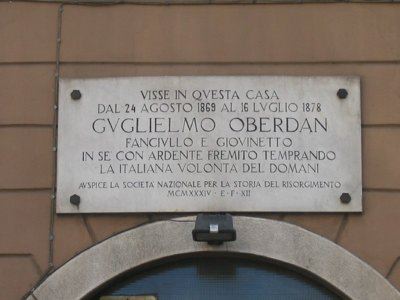 L'edificio venne realizzato nel 1851 su progetto dell'architetto Giovanni Degasperi; il disegno originale prevedeva un unico complesso per le case segnate con i numeri 23 e 25 di via Udine, le quali si presentano simili per composizione ma su diversi livelli. La struttura è caratterizzata al pianterreno da bugnato, delimitato da marcapiano, con tre archi a tutto sesto alternati a finestre. Le aperture del primo piano presentano cornici con eleganti mensole. A coronamento del prospetto si trova un cornicione ornato da modanature a dentelli. Sulla facciata spicca una lapide caratterizzata dalla seguente iscrizione: "Visse in questa casa dal 24 agosto 1869 al 16 luglio 1878 Guglielmo Oberdan fanciullo e giovinetto in sé con ardente fremito temprando la italiana volontà del domani. Auspice la Società Nazionale per la Storia del Risorgimento MCMXXXIV E-F-XII". L'edificio è vincolato limitatamente alla facciata principale.