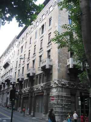 STATUE (esterno): Coppia di statue in pietra raffiguranti immagini di donna a cui corrispondono al di sopra due putti dello stesso materiale, attribuiti agli artisti Romeo Rathmann e Romeo de Paoli, colocati in corrispondenza dell'ingresso principale su Via Venti Settembre. FREGI( esterno): Fregi a rilievo a decorazione delle aperture, cornici e specchiature delle finestre con motivi floreali e vegetali su tutti e tre i lati dell'edificio. COLONNE (esterno): Colonnine con capitello con decorazioni a rilievo a motivi floreali i corrispondenza di alcune finestre del quinto piano su tutti e tre i lati dell'edificio.