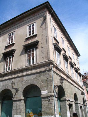 L'edificio a pianta rettangolare ricopre un intero lotto urbano ed è caratterizzato da un tessuto compositiva semplice e sobrio. Il piano terra è costituto da un portico chiuso scandito da aperture ad arco in pietra, intervallate da due aperture rettangolari sul prospetto verso Piazza Cavana. Un cornicione sporgente raccorda il pianoterra con i due piani superiori dell'edificio. Le finestre del piano nobile sono coronate da timpano rettilineo sostenuto da mensoline a voluta. Le finestre dell'ultimo piano presentano un davanzale sporgente.