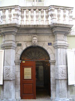 ELEMENTI ORNAMENTALI (esterno) Decorazioni a motivo floreale sono scolpite sull'architrave sorretto dai pilastri tuscanici e sulla cornice della portafinestra del primo piano. BALAUSTRA (esterno) La balaustra del poggiolo presenta colonnine ritorte in pietra. STEMMA (esterno) Stemma della famiglia Leo, raffigurante dentro uno scudo ovale inquartato due rose e bande orizzontali. Lo stemma è sormontato da una corona. MASCHERONE (esterno) Testa d'uomo con elmo in pietra collocato in chiave di volta del portale d'ingresso.
