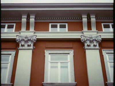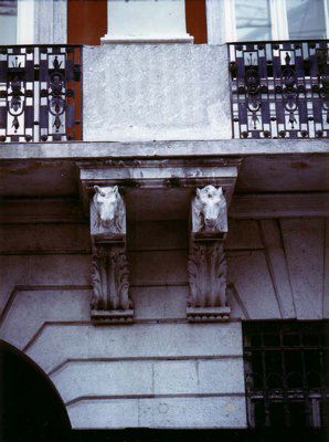 ELEMENTI ORNAMENTALI (esterno) Decorazioni a cartelle appena in rilievo sono disposte sotto le finestre del primo piano e tra le aperture della falsa loggia centrale. LESENE (esterno) Lesene lisce di ordine gigante con capitello corinzio. MENSOLE (esterno) Mensole a voluta si alternano alle finestre nel mezzanino. In corrispondenza delle lesene centrali sono disposte a coppie. Quattro coppie di mensole a voluta vegetale, decorate con mascheroni raffiguranti teste leonine ed equine, sostengono la balconata del piano nobile. MASCHERONE (esterno) In chiave d'arco del portale d'ingresso è collocato un mascherone raffigurante una testa d'uomo con elmo e cimiero.