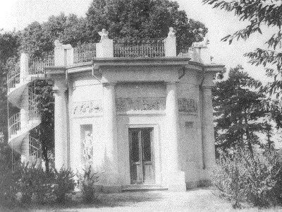 SCULTURE (esterno): Sculture raffiguranti quattro cavalli a lato della scalinata di accesso alla gloriette. SCULTURE (esterno): Sculture raffiguranti leoni, tigri, sirene e sfingi a coronamento della balaustra della gloriette. SCULTURE (esterno): Quattro sculture opera di Francesco Bonazza raffiguranti l'Abbondanza, la Pudicizia, Adone e una figura di guerriero all'interno di nicchie aperte su quattro lati dell'ottagono della gloriette. FREGIO (esterno): Fregio a rilievo raffigurante putti in diversi atteggiamenti lungo il perimetro della superificie muraria superiore della gloriette. SEMICOLONNE (esterno): Semicolonne di ordine dorico in corrispondenza degli angoli della struttura ottagonale della gloriette.