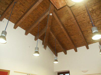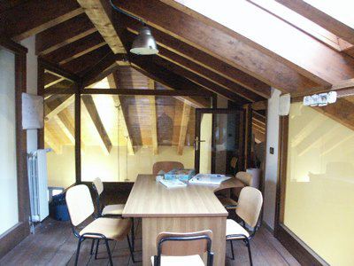 CORPO DI FABBRICA PRINCIPALE Fascia basamentale rivestita in pietra di Aursina a conci squadrati e corsi regolari orizzontali con finitura a spacco di cava. Fori architettonici con piattabanda interna ad arco ribassato e con cornici esterne in pietra di Aurisina bulinata; serramenti esterni vetrati lignei a doppia anta con sei specchiature vetrate, verniciati al naturale, di recente fattura. Superficie di facciata rifinita ad intonaco liscio sino all'intradosso di copertura; banchina in lastre di pietra di Aurisina, gronde e pluviali in lamiera verniciata esterni alla muratura perimetrale; manto di copertura in coppi curvi rossi uso Trieste. Pavimentazione interna in legno, in listoni a correre, di fattura uniforme in tutti gli ambienti. Scala interna con gradini in pietra calcarea e pianerottoli di interpiano in lastre di pietra bocciardata; parapetto metallico verniciato con corrimano ligneo. Superfici murarie trattate ad intonaco pitturato color bianco con abbassamento in smalto murale grigio chiaro. Serramenti interni di recente fattura con pannellature rifinite in laminato plastico. Spazio del sottotetto con ampia vetrata in cristallo di sicurezza, affacciata sugli spazi delle aule sottostanti. PORTICATO ESTERNO Porticato esterno con struttura verticale ed orizzontale lignea; copertura a doppia orditura con travatura principale perimetrale a correre e travatura secondaria trasversale con tavolato e manto in lamiera verniciata. Superficie di calpestio in tavolato ligneo verniciato naturale, posizionato in senso trasversale e parapetto metallico verniciato grigio. CORPO DI FABBRICA SECONDARIO Finiture molto simili a quelle del corpo principale. Basamento in pietra bianca a conci integrati nella muratura (non a rivestimento), fori architettonici rifiniti ad intonaco con davanzale in pietra calcarea, serramenti esterni lignei verniciati al naturale a doppia anta a sei specchiature con sopraluce bipartito; orditura principale e secondaria di copertura e tavolato ligneo a vista in corrispondenza dello sporto di gronda. Le superfici murarie interne risultano integralmente intonacate in colore bianco; la sala destinata ad uso palestra, presenta un pavimento rifinito in parquet ligneo; le altre superfici orizzontali risultano rifinite in piastrelle di ceramica a giunti uniti.