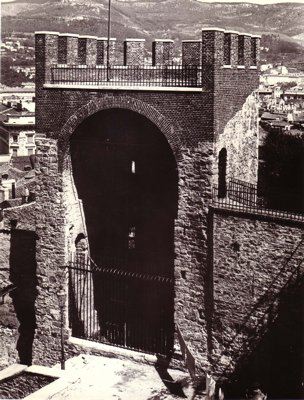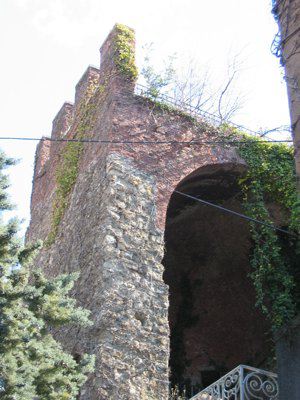 La torre presenta una planimetria a forma poligonale ed è aperta sul lato principale. Costruita in conci di pietra squadrata, è solcata da aperture a feritoia. La parte superiore voltata a botte e la merlatura, ricostruite durante il restauro del 1910, sono realizzate in mattoni per distinguerle dalla struttura originaria. L'accesso è chiuso da una cancellata in ferro.