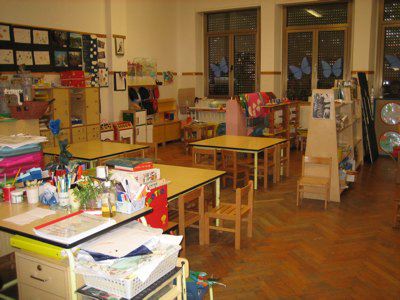 Gli anni trenta sono testimoni a Trieste di un grande interesse per l'educazione infantile che si concretizza nella costruzione di numerose scuole materne nei rioni che più ne erano sprovvisti: tra il 1933 ed il 1936 sorgono una dopo l'altra le scuole materne di S. Luigi, di Timignano, di Servola e di Barcola. Il progetto per un nuovo istituto da aprirsi nella specifica zona di Servola e destinato quindi ad aumentare la ricezione scolastica dell'antico insediamento di epoca romana, risale al 1934 allorquando si rese necessario affiancare ai due stabili già esistenti un'ulteriore struttura. La nuova scuola materna, inaugurata in via del Pane Bianco due anni più tardi, nel 1936, fu fondata dalla Lega Nazionale anche se già funzionante presso i locali messi a disposizione dalla Casa Rionale Balilla. L'edificio della nuova scuola, ad un solo piano con ampie finestre e cortile, rivela già nella sua struttura una concezione architettonica diversa, più moderna e funzionale, rispondente, nella disposizione dei locali, alle nuove esigenze igienico-didattiche imposte dal nuovo sentire. Nel 1952 vennero apportate sostanziali modifiche con l'aggiunta di una nuova ala comprendente due vani da adibirsi a sezione medica, si approfittò dell'occasione per restaurare l'intero edificio.