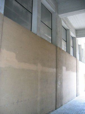 L'edificio presenta tutti i fronti in cemento a vista, eccetto il livello del pianoterra verso il piazzale che è rifinito ad intonaco tinteggiato color crema. Il passaggio porticato presenta una tinteggiatura di due tonalità differenti: color crema nella parte inferiore, bianca in quella superiore in corrispondenza delle forature. La copertura piana è completata da un sistema di grondaie e pluviali verniciati. La composizione dei prospetti viene scandita orizzontalmente da fasce in cemento a vista e da finestrature a nastro in metallo, che si sviluppano per tutta la lunghezza dei fronti. Lo spazio antistante gli ingressi del primo livello è delimitato da un parapetto in cemento che presenta alla base una sequenza di forature rettangolari. Al pianoterra gli infissi metallici sono costituiti da serramenti a tutt'altezza con specchiature vetrate sul fronte verso il piazzale, da porte a doppio battente su quello laterale. Anche le finestrature continue presentano serramenti metallici verniciati di colore scuro. Gli infissi del secondo piano sono stato sostituiti con serramenti in alluminio. All'interno del complesso si estende un'ampia area adibita a parcheggio, con un pavimento in cemento; l'accesso all'interno avviene alla stessa quota del piazzale.