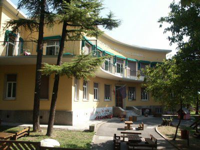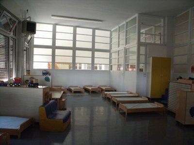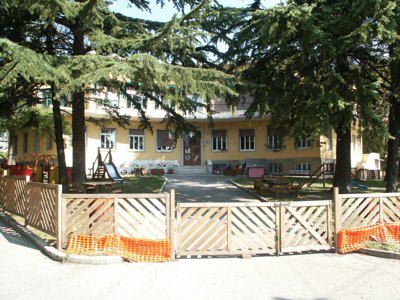 Il fabbricato, del tipo isolato su lotto di pertinenza, si inserisce in una zona periferica della città di Trieste, caratterizzata da alti fabbricati residenziali posti su lotti di pertinenza con giardino. Il corpo di fabbrica stereometrico, sviluppato su due piani fuori terra più un livello interrato, è progettato su una pianta a forma di settore circolare ed espone la facciata principale verso sud. La composizione di facciata sottolinea gli elementi orizzontali: la fascia basamentale, il balcone del primo piano e la linda in aggetto. La struttura è in muratura portante, con solai in laterocemento e balconi sporgenti con solette in calcestruzzo armato. La copertura è piana. La distribuzione interna avviene a partire da un atrio passante posto in posizione centrale, lungo un corridoio ad arco che attraversa tutta la lunghezza del fabbricato. Il vano scala, posto in prossimità dell'affaccio nord, è accessibile direttamente dall'atrio di ingresso. Le aule della scuola materna sono posizionate al primo piano, con affaccio a sud, sulla terrazza. Al piano terra sono sistemati gli uffici ed i principali spazi collettivi. Il piano interrato ospita tutte le funzioni di servizio e gli apparati tecnologici.