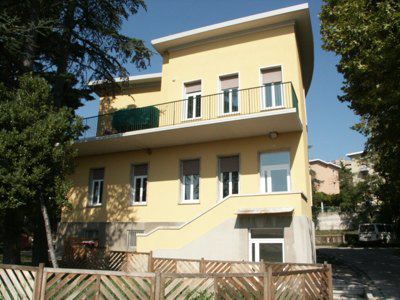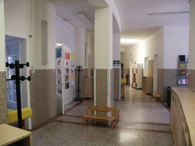 Lo schema compositivo di facciata presenta una fascia basamentale in pietra artificiale di protezione della muratura perimetrale dagli agenti atmosferici; il suo limite superiore segna il livello del piano terra rialzato, raggiungibile a mezzo di una breve scalinata esterna in pietra; sul rivestimento basamentale si aprono le finestre del piano seminterrato, in alluminio laccato bianco a tre ante, con inferriata metallica di protezione. Le restanti porzioni di facciata risultano semplicemente intonacate in color ocra. I serramenti di finestra al piano terra, a tre ante con sopraluce in alluminio laccato bianco, con avvolgibile esterno, sono riquadrati da sottili cornici in pietra naturale. Il portale vetrato di accesso è realizzato in legno massello verniciato naturale a due ante con sopraluce; semplici inferriate in ferro battuto proteggono le specchiature vetrate. Una spessa cornice in pietra bianca modanata segna l'ingresso principale. A livello del primo piano un profondo terrazzo si estende per tutta la lunghezza della facciata principale, con porte-finestra protette da avvolgibili esterni e da tende parasole ripiegabili. Un parapetto metallico verniciato a bacchette verticali corre lungo l'intero perimetro della terrazza. In corrispondenza degli estremi dell'edificio, la facciata arretra per lasciare maggior spazio alla terrazza. Il coronamento dell'edificio è completato da uno sporto di linda, rifinito da una scossalina metallica verniciata in colore grigio. Sul fronte nord i fori finestra si riducono di dimensioni e presentano alternativamente serramenti a doppia anta e serramenti ad anta singola con sopraluce, sempre protetti da avvolgibili esterni e incorniciati da sottili lastre in pietra. Internamente i pavimenti degli spazi comuni sono rifiniti in battuto di graniglia e cemento colorato. I serramenti di separazione dei corridoi e delle aule, di ampie dimensioni, coprenti l'intera altezza libera di interpiano, sono del tipo vetrato in legno verniciato in colore bianco. Le superfici murarie presentano un abbassamento in mosaico color ocra, mentre le parti restanti sono semplicemente intonacate in colore bianco. Il vano scala, del tipo appoggiato a due rampe, è rifinito con pedate in pietra di aurisina; il parapetto pieno rivestito in marmo di Aurisina è completato da un corrimano in acciaio inox posto a correre. Il pavimento delle aule è in pvc, mentre la pavimentazione della terrazza è composta da quadroni in agglomerato cementizio. Al piano interrato i pavimenti sono rifiniti in piastrelle di ceramica.