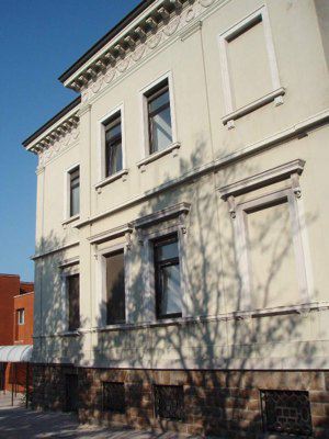 STEMMA Al centro della grata metallica del sopraluce del portone d'ingresso vi sono due iniziali in ferro "JP". CORNICE Sotto la linea di gronda, lungo tutto il perimetro dell'edificio, si sviluppa una fascia con decorazioni lapidee in rilievo, raffiguranti ghirlande, elementi vegetali e nastri.