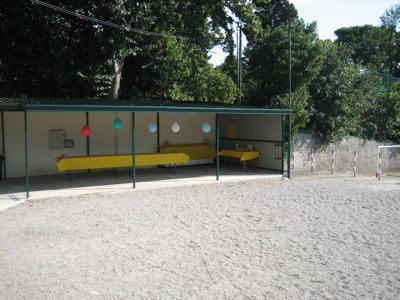 Edificio isolato che si sviluppa su due livelli fuori terra con struttura portante in arenaria a vista, solai in laterocemento e copertura a 4 falde inclinate con abbaini. Le facciate presentano un basamento in pietra con rivestimento in intonaco bugnato bianco, una fascia marcapiano e una cornice, che corrono lungo tutto il perimetro dell'edificio, aggettanti in pietra arenaria rivestita in intonaco bianco. Pluviali esterni alla muratura in pvc su tutti gli affacci con grondaia in metallo verniciato. Le apertura sono regolari con cornici in pietra bianca e serramenti in pvc bianco. Le aree esterne si sviluppano su due diversi livelli e presentano una pavimentazione composta da un marciapiede in cemento con gradini in prossimità degli ingressi; il giardino è in ghiaia ed ospita una piccola tettoia con struttura metallica, mentre le aree attrezzate per i giochi all'aperto sono in battuto di cemento. L'intera area è delimitata da una recinzione metallica e l'ingresso sul lato strada presenta un portone metallico verniciato di color verde. La facciata che si apre sul lato strada presenta al primo livello un piccolo terrazzo centrale con mensole laterali e ringhiera metallica. La facciata opposta presenta un rivestimento in intonaco di color verde scuro. L'interno presenta al piano terra un rivestimento in piastrelle ceramiche di color ocra, pareti con tinteggiatura bianca e porte lignee a due battenti verniciate di bianco.