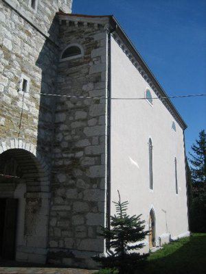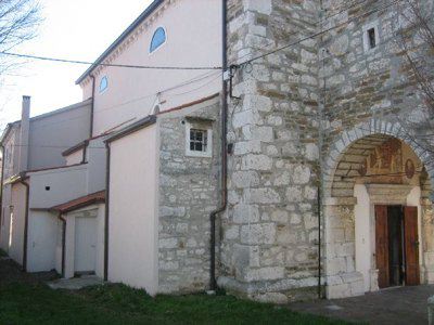 Complesso architettonico composto dalla chiesa storica dell'abitato di Prosecco. La chiesa è a pianta centrale con navata unica e presenta una facciata a capanna con campanile centrale sorretto da quattro archi a tutto sesto che ne costituiscono l'ingresso voltato. Struttura portante in pietra arenaria a vista nella facciata principale e intonacata nelle restanti facciate, abside segmentato e corpi accessori addossati lungo il fianco sinistro. Copertura a falde inclinate con manto in coppi curvi rossi, pluviali e gronde in lamiera con verniciatura. Aperture regolari e di piccole dimensioni con cornici in pietra bianca squadrata, due mezzelune sulla facciata principale e finestre ad arco allungate sul fianco destro. Il campanile presenta aperture a bifora con colonnina centrale e una balaustra in pietra. L'ingresso principale è costituito da un portale in pietra con mensola aggettante superiore e affresco decorativo nel sopraluce. Internamente la chiesa presenta soffitto, abside e pareti decorate ad affresco con motivi floreali e scene bibliche; l'altare è in marmo; il coro, in posizione rialzata sopra l'ingresso, è sorretto da due pilastri in marmo e presenta un parapetto ligneo con decorazioni pittoriche.