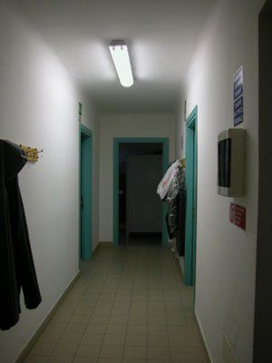 L'edificio presenta i fronti esterni omogenei, caratterizzati dai medesimi elementi compositivi e rifiniti ad intonaco liscio. La tinteggiatura è di colore grigio al pianoterra e gialla nei livelli superiori; lo strato di finitura è fugato al pianoterra e raccordato con lo zoccolo in pietra grigia. Al primo e al secondo piano sono stati realizzati, inoltre, dei riquadri in intonaco color terra chiara che formano delle decorazioni geometriche e sottolineano la composizione e i profili dei prospetti; vi sono anche delle lesene squadrate, tinteggiate in grigio e talvolta fugate per mimare la disposizione di conci lapidei. Le separazioni tra i diversi livelli sono evidenziate da due fasce marcapiano: quella inferiore di maggiore dimensione e squadrata, quella superiore modanata e tinteggiata in grigio e terra. Al pianoterra sono state ricavate delle forature rettangolari, chiuse da una grata metallica o murate, con concio di chiave bocciardato. Lungo i lati si aprono gli ingressi degli uffici, costituiti da serramenti in legno scuro a due ante con specchiature in rilievo, mentre i fori d'accesso ai bagni pubblici sono dotati di infissi lignei ad un'anta, tinteggiati di colore verde e con specchiature decorate, in parte vetrate. Al primo piano vi sono finestre allineate, con serramenti in legno a due battenti tinteggiati all'esterno di colore verde scuro e composti da tre specchiature vetrate; i fori sono completati da una balaustra metallica verniciata in verde e decorata con motivi a voluta. Attorno ai fori si sviluppa una cornice lapidea e nella parte superiore vi è una mensola in pietra decorata in aggetto. Le aperture poste in corrispondenza del sottotetto riprendono la tipologia di quelle sottostanti ma con battenti a due specchiature, una balaustra più piccola e sono prive della mensola soprastante. La copertura lignea è a falde con coppi; le grondaie ed i pluviali in lamiera consentono il deflusso delle acque meteoriche. Nei fronti laterali, inoltre, la linea di gronda è sottolineata da una fascia decorativa in intonaco a bande caratterizzata dall'alternanza di le due tonalità di colore. All'interno gli ambienti risultano disposti lungo un corridoio centrale che si sviluppa a partire dal vano scale. Le superfici verticali sono rifinite ad intonaco, tinteggiate di colore bianco, mentre i pavimenti si diversificano nei due livelli: pvc striato di colore verde chiaro nella zona uffici, piastrelle in ceramica per gli spogliatoi soprastanti. I soffitti sono anch'essi ad intonaco bianco. I gradini che compongono le rampe del vano scale e i relativi pianerottoli sono rivestiti in pvc: la ringhiera che completa le scale è in ferro lavorato, verniciato di colore scuro. I pavimenti sono alla veneziana, con diverso colore e granulometria, decorati da una cornice esterna perimetrale di colore più scuro. I serramenti interni lignei sono a più ante e tinteggiati di colore verde.