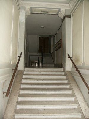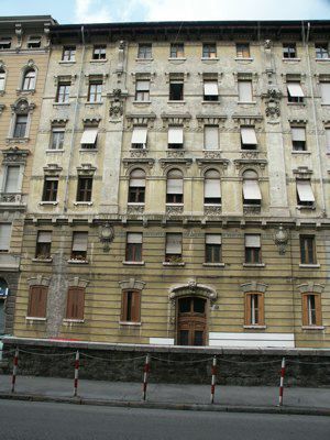 Entrambe le facciate presentano un alto basamento a bugnato liscio in intonaco. Un abbassamento in pietra bianca bocciardata protegge l'intonaco dagli agenti atmosferici. Il portone di ingresso in posizione centrale, ligneo a doppia anta con sopraluce vetrato e inferriate di protezione con disegni a voluta, è decorato a bassorilievo con motivi in stile floreale. L'architrave ad arco ribassato è decorato da volute laterali e da una chiave di volta in pietra bianca in stile floreale. Al piano terra fori architettonici ad arco ribassato con conci ad intonaco e davanzali in conglomerato cementizio, riquadrano serramenti lignei vetrati a doppia anta con quattro specchiature; gli oscuri esterni sono del tipo a libro, verniciati in colore marrone. Al primo piano i serramenti rettangolari a doppia anta con quattro specchiature con davanzale in pietra artificiale sono protetti da avvolgibili lignei. Una cornice con profilo squadrato con gocciolatoio e mensole, definisce il limite superiore del bugnato. Due medaglioni decorativi separano i quattro fori centrali di facciata da quelli laterali. Una fascia decorativa con motivi floreali unisce orizzontalmente i fori del primo piano all'altezza dell'architrave. Nella parte superiore della facciata due paraste separano i quattro fori centrali dalle due coppie di fori laterali. Due medaglioni sono posti a livello del solaio del quarto piano. Al secondo piano i quattro fori architettonici centrali presentano specchiature sotto-finestra decorate da motivi floreali. Mensole in pietra artificiale sostengono un architrave orizzontale a sporgere modanato posto a protezione dell'arco modanato che chiude la lunetta vetrata. Avvolgibili in legno proteggono i serramenti a doppia anta con quattro specchiature. Lateralmente semplici fori architettonici rettangolari sono protetti da architravi decorate con medaglioni. Al terzo piano i fori centrali rettangolari seno sottolineati da decorazioni floreali nel sottofinestra, davanzali a sezione squadrata in pietra artificiale, architravi ribassati con finti conci ad intonaco e architrave modanato sorretto mensole laterali. Al quinto piano tutti i fori sono trattati in maniera omogenea con davanzale a sezione squadrata e mensole a voluta che sostengono un architrave aggettante. I serramenti sono sempre del tipo a due ante a quattro specchiature con avvolgibile. Una fascia con motivi geometrici ad intonaco collega orizzontalmente i fori dell'ultimo livello. Una seconda fascia con modanature ad ovulo descrive il raccordo con lo sporto di copertura ed è interrotta da mensole lignee poste a sostegno di una trave di bordo a sua volta posizionata a supporto delle travi di copertura, che sorreggono il tavolato. Gronde e pluviali sono in lamiera. La copertura semipiana presenta un manto in guaina ardesiata. Internamente gli atrii presentano una pavimentazione in marmette colorate di graniglia e cemento. La rampa di scale che porta al piano terra rialzato è rivestita in pietra di Aurisina. Le pareti sono intonacate e rifinite con riquadri a smalto e cornici in gesso. In cima alla rampa di accesso al piano terra rialzato un foro architravato con mensole a voluta permette il passaggio attraverso la muratura portante. Il vano scala presenta la scala con gradini in pietra di Aurisina, parapetto metallico verniciato decorato da motivi geometrici e corrimano ligneo verniciato naturale. Un abbassamento a smalto e una fascia battipiede color marrone protegge l'intonaco. I pianerottoli di interpiano sono pavimentati in piastrelle con motivi geometrici colorati. I serramenti di ingresso agli appartamenti sono in legno a doppia anta, verniciati a smalto. Sulle corti interne dalle facciate, semplicemente intonacate lisce, si aprono i serramenti dei vani scala e dei vani accessori degli alloggi.