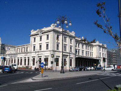 La struttura della stazione è caratterizzata da una planimetria a "U", con i prospetti principali che si affacciano uno in via Ottaviano Augusto, rivolto verso il mare e uno su via Giulio Cesare. La facciata rivolta verso il mare è costituita da due corpi laterali di tre piani e un corpo centrale leggermente arretrato, sempre di tre piani. Nei corpi laterali, al pianterreno, semicolonne in stile neorinascimentale e neomanieristico fiancheggiano le finestre centrali dei corpi aggettanti. Al primo piano, paraste incorniciano le aperture centrali. Frontoni triangolari concludono in alto i corpi laterali. Sul tetto corre una balaustra con pilastri ornati da cartigli agli angoli. Il corpo centrale arretrato presenta, al pianterreno, paraste a bugnato e decorazioni vegetali sotto ai frontoni delle finestre. Il piano superiore è caratterizzato da lesene lisce e cimase lineari a coronamento delle finestre. Al centro si eleva un timpano a semicerchio sormontato da un elemento scultoreo a conchiglia. Il fronte che si affaccia su via Giulio Cesare presenta, al centro, l'ingresso principale alla stazione ed è caratterizzato da due corpi di solo un piano e una parte centrale sopraelevata di un piano. L'ingresso, sormontato da un ampia finestra termale, è fiancheggiato da due torrette. Presenta episodi decorativi a rilievo ai lati e sopra l'arco centrale. Una cornice a dentelli conclude in alto la facciata.