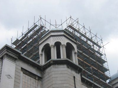 AFFRESCHI (interno): Affreschi raffiguranti "Cristo Pantocratore" con gli "Angeli reggicartigli" nella cupola centrale, nelle absidi laterali "San Spiridione al concilio di Nicea" e la "Vergine Assunta". Nella superficie superiore dell'ingresso la "Tomba di San Spiridione" e al di sopra delle porte laterali le immagini del "Profeta Elia" e il "San Giovanni Battista". I rimanenti mosaici della facciata principale rappresentano i "Quattro Evangelisti" e il "Padre Eterno". ICONOSTASI (interno): Iconostasi formata da dipinti raffiguranti la "Crocefissione" al centro ed ai lati la "Resurrezione" e il "Battesimo di Cristo". A completamento della struttura si trovano quattro icone che rappresentano "San Spiridione, la "Vergine col Bambino", "Cristo Re" e l'"Annunciazione". MOSAICI (esterno): Mosaici raffiguranti "San Spiridione" al di sopra dell'ingresso principale, "San Michele Arcangelo" e i "Santi Atanasio" e "Gregorio Nazianzeno" nelle lunette laterali. Sulla parete destra si trovano le raffigurazioni della "Madonna con Bambino" e i "Santi Basilio" e "Giovanni Crisostomo". I mosaici rimanenti rappresentano teorie di santi. SCULTURE (esterno): Statue di "Santi" a decorazione delle nicchie della facciata principale.