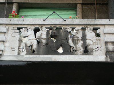 ELEMENTI ORNAMENTALI (esterno) Bassorilievi in pietra artificiale tipici di epoca fascista sono posti a decorazione dei parapetti dei balconi della facciata principale e raffigurano scene lavorative del campo delle costruzioni edili.