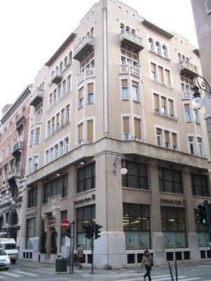 Nel 1911 la "Zivnotenska Banka" di Praga acquistò un lotto nel borgo teresiano per la costruzione di un'edificio destinato ad ospitare gli uffici della banca e alcune abitazioni. Il progetto fu elaborato dall'architetto Josef Costaperaria con la collaborazione del consigliere edile, l' architetto Osvaldo Polivka nel 1912 Nel 1956 l'immobile venne ceduto alla Banca d'America e d'Italia, che commissionò diversi lavori di modifica agli interni. In particolare, nel 1957 un progetto di modifica al primo piano comportò lo smantellamento della vetrata poligonale della sala d'aspetto. Nel 1977 un progetto di rinnovo dei locali del salone casse implicò lo smantellamento degli arredi originari e la sostituzione della scala di raccordo con il piano rialzato. Infine, nel 1986, la scala a chiocciola originale fu sostituita con una scala a tre rampe ortogonali. Dal 1995 l'immobile ospita una filiale della Deutsche Bank. L'edificio costituisce un esempio unico di architettura in cui si fondono le tecniche razionalistiche d'inizio Novecento con armonie di tardo gusto secessionista mitteleuropeo. Ai lati del portone d'ingresso sono presenti due statue bronzee raffiguranti l'industria e l'agricoltura, realizzate dagli scultori Ladislav Salun e Franta Anyz, autori anche del bronzo raffigurante la Navigazione, presente nel salone.