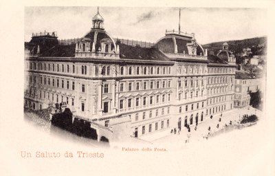 L'imponente palazzo venne costruito tra il 1890 e il 1894 su progetto dell'architetto viennese Friedrich Setz, sull'area in precedenza occupata dall'edificio della Dogana. Costruito dall'impresa Gregersen e Schwarz sotto la direzione dell'ingegnere Guido Levi, l'immobile costituisce un significativo esempio di architettura eclettica nell'ambito della tipologia comune agli edifici pubblici austriaci dell'epoca. Il palazzo venne concepito fin dall'inizio per ospitare sia gli uffici postali e telegrafici sia quelli della finanza, per cui all'interno è strutturato in due corpi distinti, con ingressi separati rispettivamente in piazza Vittorio Veneto e Largo Panfili. Sui prospetti laterali si aprono i portoni per il transito dei carri postali. All'ultimo piano della facciata principale sono collocate alcune statue. A coronamento della parte centrale della facciata vi è una copertura a cupola al centro della quale è collocato un abbaino delimitato da due erme e con un orologio. Cupole si ergono anche agli angoli della costruzione. All'interno si apre un atrio spazioso da cui parte, al centro, un grande scalone che da accesso al vestibolo superiore. Al primo e al secondo piano corridoi con arcate a crociera si affacciano sul vestibolo.