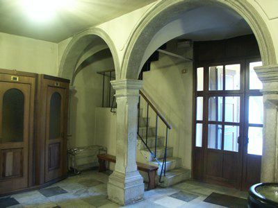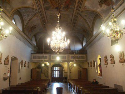 ISCRIZIONE (esterno) Sull'arco acuto dell'ingresso laterale è scolpita la data del 1584, presumibile data di edificazione della chiesa. ISCRIZIONE (esterno) Sull'architrave dell'ingresso principale si legge un'iscrizione dedicata al vescovo Rinaldo Scarlichio che consacrò nel 1628 l'edificio: "Antist(ite) et com(ite) Terg(estimo) Reinaldo Scarlichio an(n)o sal(utis) MDCXXVIII". EPIGRAFE (esterno) Su un concio a destra dell'ingresso principale si legge: "Anno D(omi)ni MDLXX/XIIII mensis Juni XIII / clavigari Marcus Boga/tac [...] Iacob Bosall [...]". AFFRESCO (interno) La volta sopra la navata, trattata a fresco da F. Ferlettig nel 1910, ospita la raffigurazione dell'Invenzione della Croce. STATUE (interno) L'altare maggiore è arricchito dalle statue marmoree raffiguranti S. Rocco, la Madonna, S. Giovanni Evangelista e S. Primo. AFFRESCO (interno) La volta dell'abside è decorata a fresco con la scena di Gesù nell'Orto. AFFRESCO (interno) Sulle pareti orientali delle cappelle laterali l'artista Antonio Jelo?in dipinse nel 1921 la scena della Liberazione di San Pietro e la raffigurazione della Sacra Famiglia. ELEMENTI ORNAMENTALI (interno) Sull'altare destro una pala decorata ad olio da una suora nel 1975 raffigura i Santi Pietro e Paolo, mentre sull'altare sinistro campeggia una statua lignea dedicata alla Madonna con Bambino. ELEMENTI ORNAMENTALI (interno) Alle pareti è raffigurata la Via Crucis in pannelli lignei a bassorilievo.
