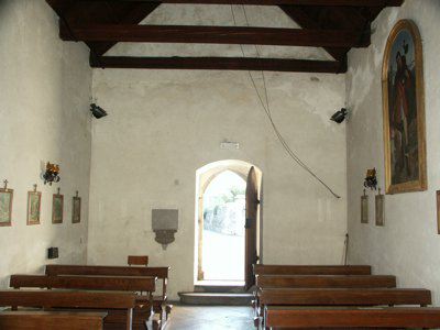 La piccola cappella di S. Rocco, con orientamento nord-ovest - sud-est, si posiziona al centro di uno spazio internamente alla biforcazione di una strada in due percorsi secondari, al margine sud-est del borgo storico di S. Croce. Percettivamente conclude con la propria torre campanaria uno degli assi viari interni al borgo, che si dipartono dalla chiesa principale e dal cimitero. La distribuzione interna è semplice, ad aula, con abside terminale. La composizione seicentesca della facciata raggruppa la torre campanaria e l'ingresso principale in un unico elemento architettonico, che segna la simmetria principale della facciata. La struttura verticale è costituita da muratura portante in pietra bianca sbozzata, posata a corsi irregolari; la copertura a falde è costituita da una struttura lignea a capriate a sostegno di un manto in lastre di pietra calcarea.