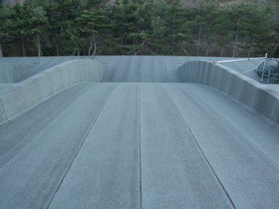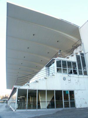 La struttura è completamente trattata in clacestruzzo armato facciavista, dipinto direttamente senza intonacatura. Le superfici vetrate completamente apribili sono in alluminio satinato. Le gradonate esterne ospitano i seggiolini conformati in plastica e le scale si distribuzione alla tribuna sono rivestite in gomma antiscivolo. I parapetti sono costituiti da semplici correnti tubolari sovrapposti verniciati in color marrone. Internamente le superfici sono per lo più spoglie e lasciano leggere pienamente la struttura, che è posta a fondamento del progetto architettonico. La pavimentazione è costituita da marmette colorate di graniglia e cemento al piano terra, da piastrelle in gres porcellanato al primo piano, mentre le scale di accesso ai piani superiori della tribuna sono rivestite in marmo travertino. L'estradosso di copertura è rivestito e impermeabilizzato completamente in guaina ardesiata; l'acqua piovana viene raccolta nella concavità della vela e convogliata a terra in pluviali posti internamente alla struttura in calcestruzzo armato.