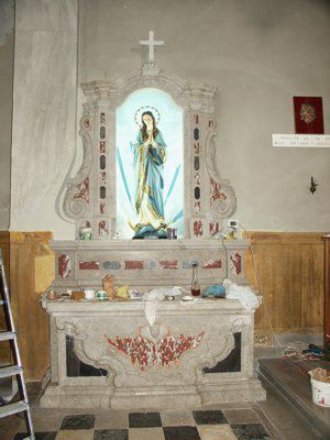 STATUE (interno) L'immagine della Madonna orna l'altare sul lato sinistro, mentre la statua di San Giusto, portata dalla cattedrale triestina, è collocata simmetricamente sull'altare destro. AFFRESCO (interno) Una decorazione a tempera, opera dell'artista Tone Kralj, raffigura l'ultima cena sulla parte alta della parete di fondo dell'abside.