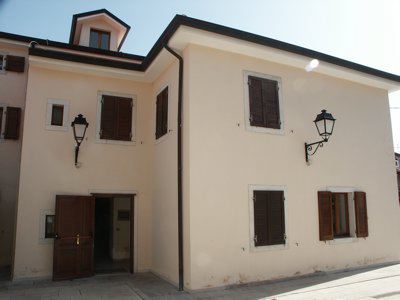 Il fabbricato si caratterizza sul lato fronte strada per il trattamento della facciata in pietra facciavista a tutta altezza. Sugli altri fronti i prospetti risultano invece semplicemente rivestiti a intonaco liscio color rosa chiaro. I fori architettonici sono tutti riquadrati da cornici in pietra bianca; i serramenti vetrati in legno verniciato naturale a doppia anta a due specchiature sono protetti da oscuranti esterni esterni a lamelle orizzontali fisse. Il portone di ingresso a due ante lignee, è delimitato da una cornice in pietra bianca, con architrave decorativo riportante la presunta data di edificazione. Lo sporto modanato della linda, realizzato in calcestruzzo armato facciavista, supporta il canale di gronda in lamiera verniciata color testa di moro. La copertura a falde discontinue presenta un manto in coppi curvi rossi uso Trieste. Internamente le finitura sono costituite da gres porcellanato al pavimento e intonaco bianco alle pareti. La scala di distribuzione ai piani superiori è semplicemente rivestita in guaina antiscivolo.