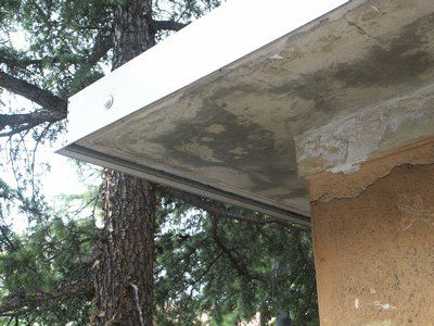 Un abbassamento in pietra artificiale protegge la parte inferiore della muratura rifinita su tutta la superficie ad intonaco liscio. I fori architettonici squadrati presentano cornici e davanzali in pietra artificiale, serramenti lignei verniciati bianchi e serrande esterne in lamiera zincata. La copertura piana con uno sporto di linda a protezione della muratura perimetrale, presenta manto in guaina catramata e scossalina perimetrale in lamiera zincata verniciata grigia.