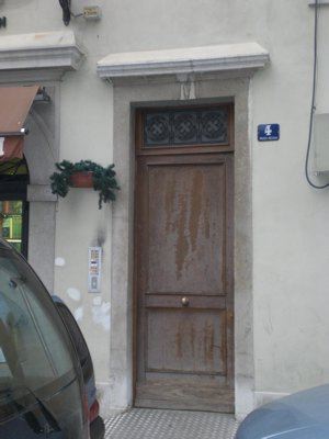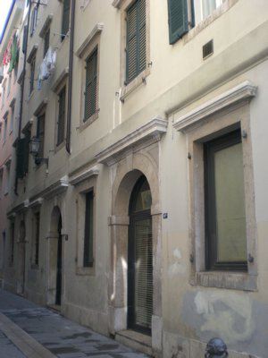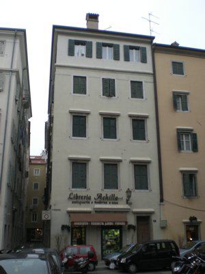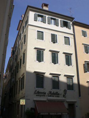 L'edificio sorge all'interno della zona più antica di Trieste, Cittavecchia, modificata negli anni Trenta del Novecento da pesanti interventi avviati con il progetto di sistemazione del colle di San Giusto. Tra gli immobili risparmiati dalle demolizioni rientra l'edificio con affaccio su Piazza Vecchia e Via delle Ombrelle, occupato al piano terra da un locale commerciale e ai piani superiori da abitazioni. In linea con l'antica tipologia architettonica del borgo, la struttura presenta fori finestra e bassi portali ad arco arricchiti da cornici lineari in pietra bianca d'Aurisina e capitelli. Interessante risulta la presenza sulla facciata di Piazza Vecchia di una colonna in pietra a sezione ottagonale, con basamento e capitello, che documenta l'origine antica dell'edificio. Al 1852 risale un primo progetto di modifica sull'immobile che prevedeva l'aggiunta di un quarto piano, come testimonia la presenza in facciata di una cornice marcapiano in pietra. Nel 1913 si intervenne sull'atrio principale, eliminando l'entrata da Via delle Ombrelle, e sull'interno pianoterra per "adattamento ad uso trattoria". Con il "Piano di Recupero", L 457 del 1978, esteso all'intero isolato tra il 1984 ed il 1985, l'immobile è oggetto di importanti modifiche, a firma dell'architetto Franco Stagni, concernenti, in particolare, il restauro degli elementi architettonici esterni.