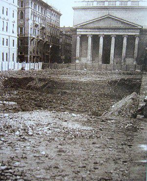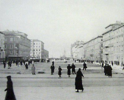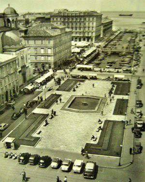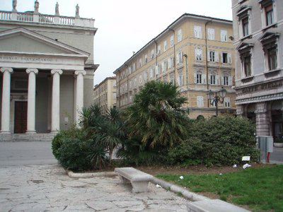 La zona delle antiche saline a ponente delle mura della città medievale, demolite, per volere dell'imperatrice Maria Teresa d'Austria nel 1749, cominciò ad essere bonificata già a partire dagli inizi del XVIII secolo concretizzando il progetto del suo totale interramento allorquando la sovrana cedette al Comune i fondi su cui erigere la futura città Teresiana. Il vasto terreno paludoso più vicino al mare era attraversato, all'epoca, da tre canali di diversa grandezza accessibili alla navigazione di piccolo cabotaggio messo a servizio delle saline: uno, detto del Vino o Piccolo, lungo un centinaio di metri interrato per motivi igienici nel 1816. Uno medio, corrispondente pressappoco all'attuale canale che dalla chiesa di S. Antonio Nuovo conduce fino al mare ed infine un terzo, più corto degli altri due. Quando si stabilì di bonificare l'area, si prese in considerazione il progetto di interrare il più piccolo, allargare il medio (rendendolo agibile ai bastimenti di stazza maggiore) e conservare il canale del Vino. Per ordine di Maria Teresa, il 14 ottobre 1756, il Canal Grande venne ampliato e dotato di una sponda murata sotto la direzione dell'architetto Matteo Pirona al costo di 90.000 fiorini. Inizialmente lungo le sponde furono piantati degli alberi, immantinente tolti per probabili motivi di ordine pratico, intralciando l'ormeggio dei bastimenti ed il transito delle merci. Largo 28,4 metri, il corso d'acqua era attraversato da due ponti di ferro mobili: il cosiddetto Ponte Verde e il più noto Ponte Rosso, che metteva in comunicazione l'omonima piazza con l'allora Via delle Poste. Nel 1769 venne eretta, nel tratto antistante la parte terminale del Canal Grande, una chiesa barocca dedicata a S. Antonio che, come ci ricorda il Generini, fu costruita con il "peculio di pii benefattori ad iniziativa dei fedeli dell'antica confraternita dei nobili addetta alla chiesa volgarmente nota per S. Antonio vecchio". Lo spazio compreso tra il nuovo fabbricato ed il canale prese quindi il nome di Piazza S. Antonio. La chiesa fu restaurata nel 1784 e, ritenuta non più consona alle mutate situazioni demografiche, fu demolita e sostituita, nel 1827, con l'attuale edificio progettato dall'architetto Pietro Nobile. Il nuovo tempio, consacrato dal vescovo Bartolomeo Legat, fu officiato per la prima volta il 3 aprile 1842, ma completato appena nel 1849. Allorquando i lavori di fabbricazione dell'edificio erano in fase di ultimazione, si decise di portare a termine anche il progetto di sostituzione del vecchio selciato nella parte antistante la chiesa. La lastricazione della Contrada di S. Antonio avvenne, infatti, in periodi successivi, tra il 1820 ed il 1835, allorquando tutta l'originaria pavimentazione della città venne sostituita con delle pietre più regolari ed ordinate. Nel 1820 Il Consiglio comunale aveva perfino avvallato un progetto di modifica delle ruote dei carri addetti al trasporto delle merci da un magazzino all'altro, di modo che la pavimentazione del nuovo lastricato non potesse esser compromessa. Nel 1824 il Comune decretò anche la costruzione di una ringhiera di ferro battuto da sistemarsi sulla testa del canale, proprio dirimpetto alla facciata della chiesa. Ma la demolizione del vecchio edificio e il notevole rallentamento dei lavori del nuovo, di fatto, condizionarono l'effettiva selciatura dell'area prospiciente la chiesa stessa che, ingombra delle travature di legno a protezione del nuovo fabbricato, impedirono per un bel pezzo la possibilità di posare le nuove pietre. Nel 1832 parte dei lavori dovevano però essere ultimati, se è vero che il Comune dovette fare espressa richiesta all'imprenditore Valentino Valle, responsabile della pavimentazione, di abbattere, sulla Piazza del Ponterosso, il casotto eretto per "comodo delli lavori da tagliapietre della nuova chiesa di S. Antonio, casotto lì da quasi 5 anni". Le "Condizioni d'incanto" del 1830, relative alla pavimentazione della piazza precisavano, inoltre, che le pietre del vecchio selciato non dovevano essere buttate via, ma trasportate fino al Borgo Giuseppino, sulla riva del mare, per "proseguire il nuovo quais". Nel 1934 si diedero avvio a quei lavori di interramento del canale che portarono Piazza S. Antonio ad assumere l'odierna fisionomia: una fontana centrale al posto dell'acqua e sei aiuole fiorite da contorno. Utilizzando il materiale proveniente dalle demolizioni di Cittavecchia, l'ultimo tratto dell'antico corso d'acqua piano piano scomparve. Il nuovo spazio che ne derivò prese il nome di Piazza Umberto I. Tra le curiosità degne di nota figura quella dell'interramento, all'interno del canale, di una torpediniera austriaca che, trovandosi lì ormeggiata da tempo e ormai fuori uso, venne ricoperta dal materiali di riporto, una volta adagiatasi su un fianco. Giace ora sotto la fontana, testimone silente di un passato ormai dimenticato. Dando le spalle alla chiesa, sul lato sinistro vale la pena di sottolineare la presenza di un altro edificio di interesse storico e sociale di non secondaria importanza: il Caffè Stella Polare. Nel 1900 a causa dei lavori di ristrutturazione della Casa della Comunità Serbo ortodossa, il Caffè, lì ospitato, venne chiuso, si pensò allora di erigere un fabbricato provvisorio, in cemento e legno, che fu ubicato proprio di fronte alla chiesa nello spazio davanti al canale. Ebbe forme secessioniste e durò alcuni anni sino all'inaugurazione del nuovo palazzo progettato dall'ingegner C. Cambiario nel 1902. Durante gli anni Quaranta e Cinquanta la piazza fu utilizzata come parcheggio autovetture.