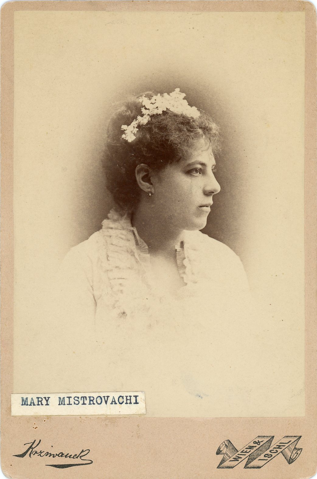 Nel 1899 K. u. K. Hof-Photograph Rudolf Krziwanek Wien VII Hofstallstrasse 5 Atelier neben Deutschen Volkstheater Jschl Franzensallee 10; timbro A. F. Czihar's & Nachfls. Kunsthandlung Wien Graben 22.