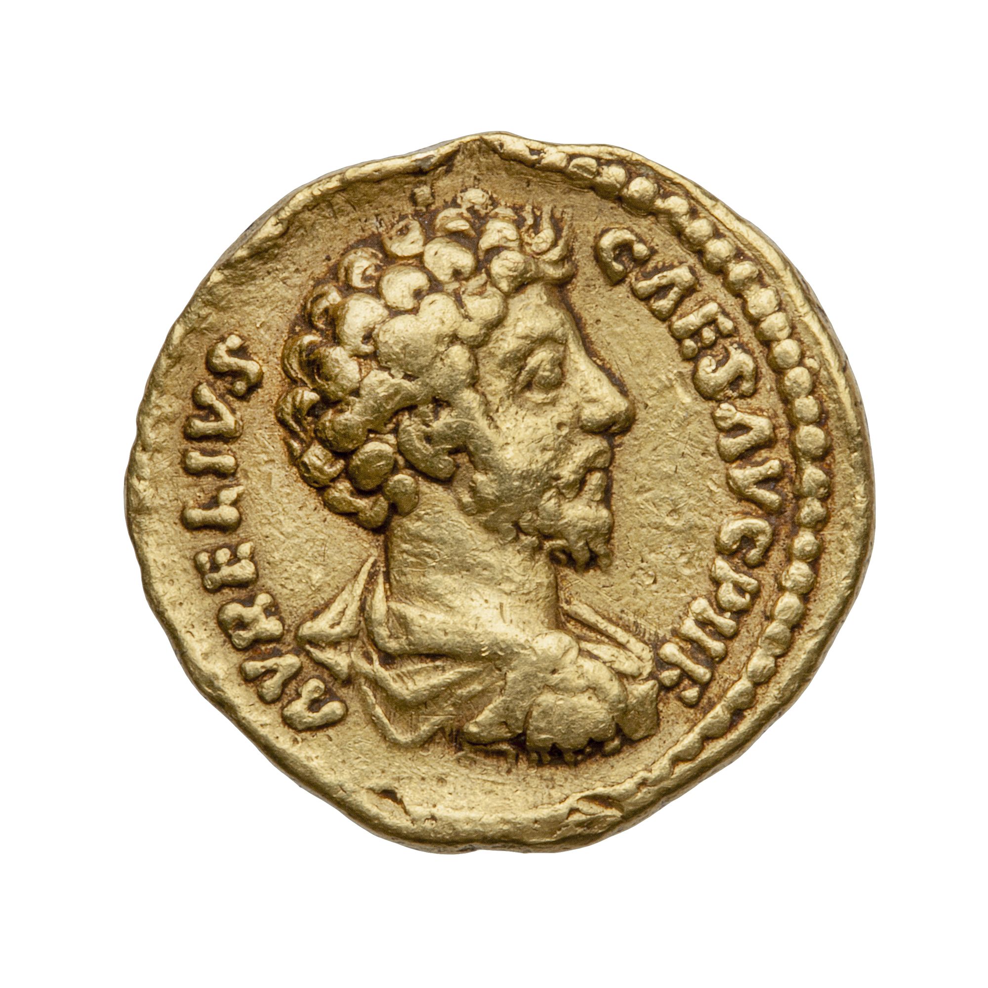 Busto dell’imperatore di profilo, rivolto a destra, senza corona ma con capelli e barba ricci; le spalle sono coperte dalla toga.; AURELIUS CAES AUG PII F (Aurelio Cesare, figlio dell’Augusto Pio)