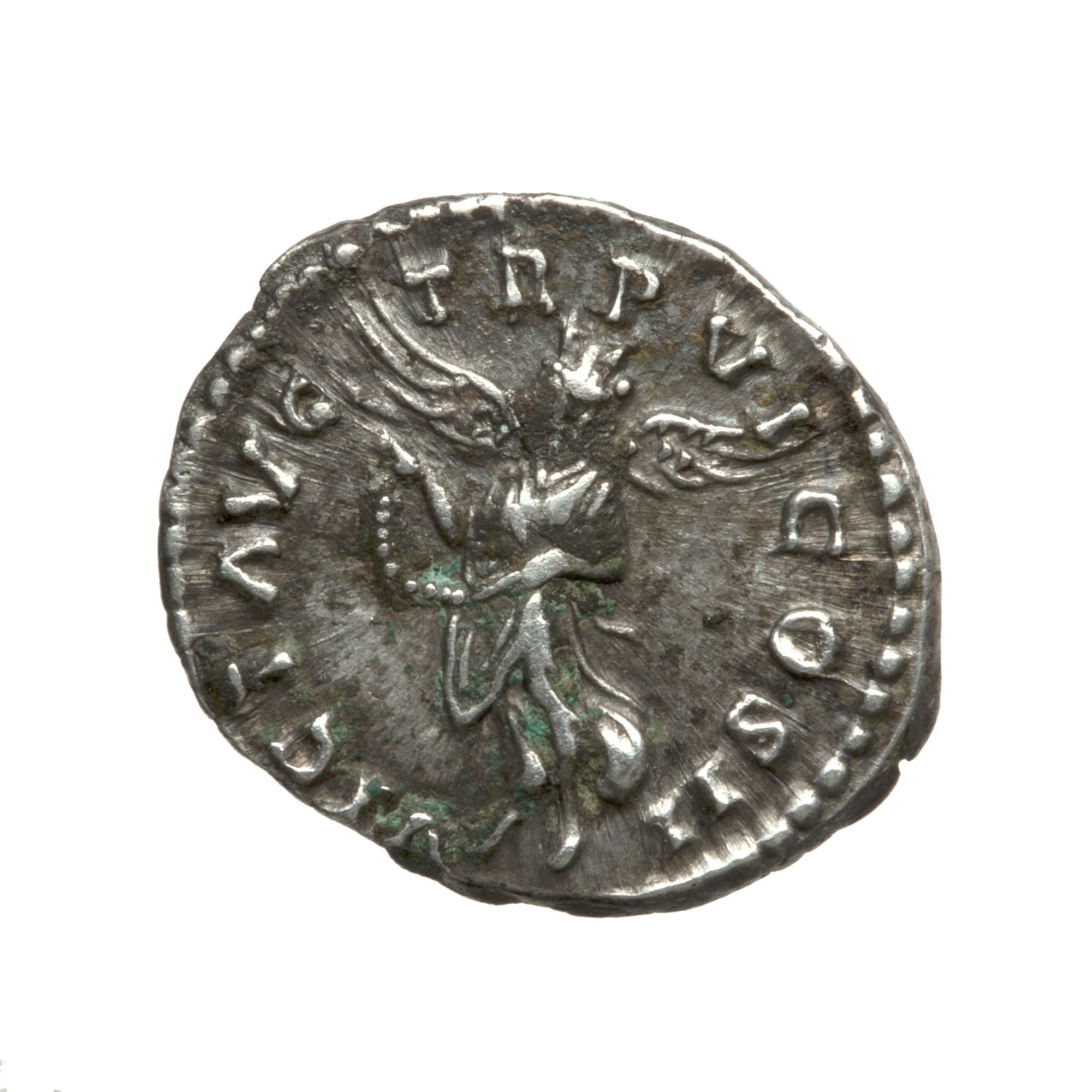 Figura femminile di Vittoria alata, rivolta verso sinistra, che tiene tra le mani un diadema.; VICT AUG TR P VI COS II (per la Vittoria dell’Augusto, tribuno della plebe per la sesta volta, console per la seconda volta)