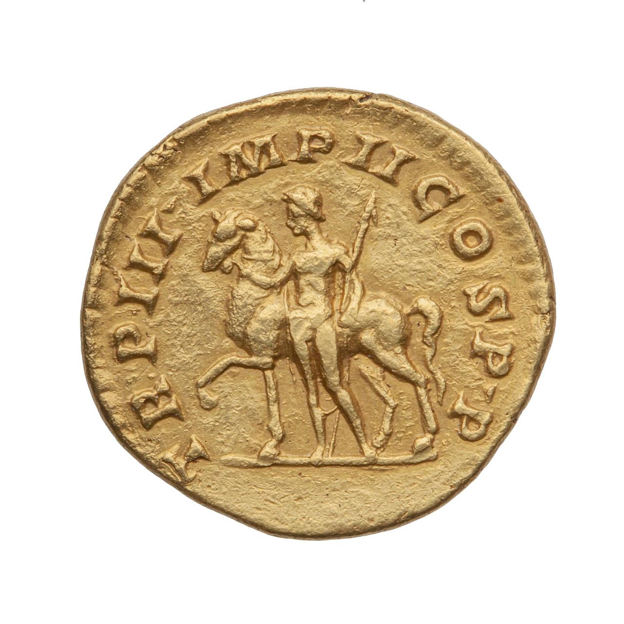 Figura di Castore che regge una lancia con una mano e con l’altra conduce un cavallo.; TR P III IMP II COS PP (tribuno della plebe per la terza volta, dotato di imperium per la seconda volta, console, padre della patria)