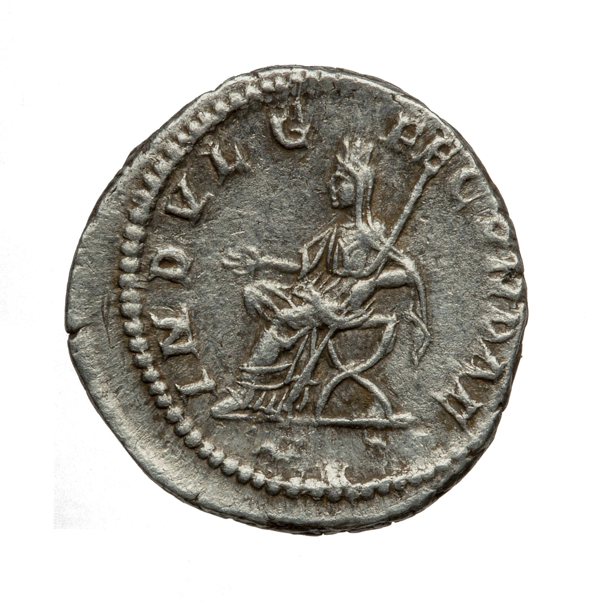 Denario con testa di Caracalla / Personificazione dell'Indulgenza feconda