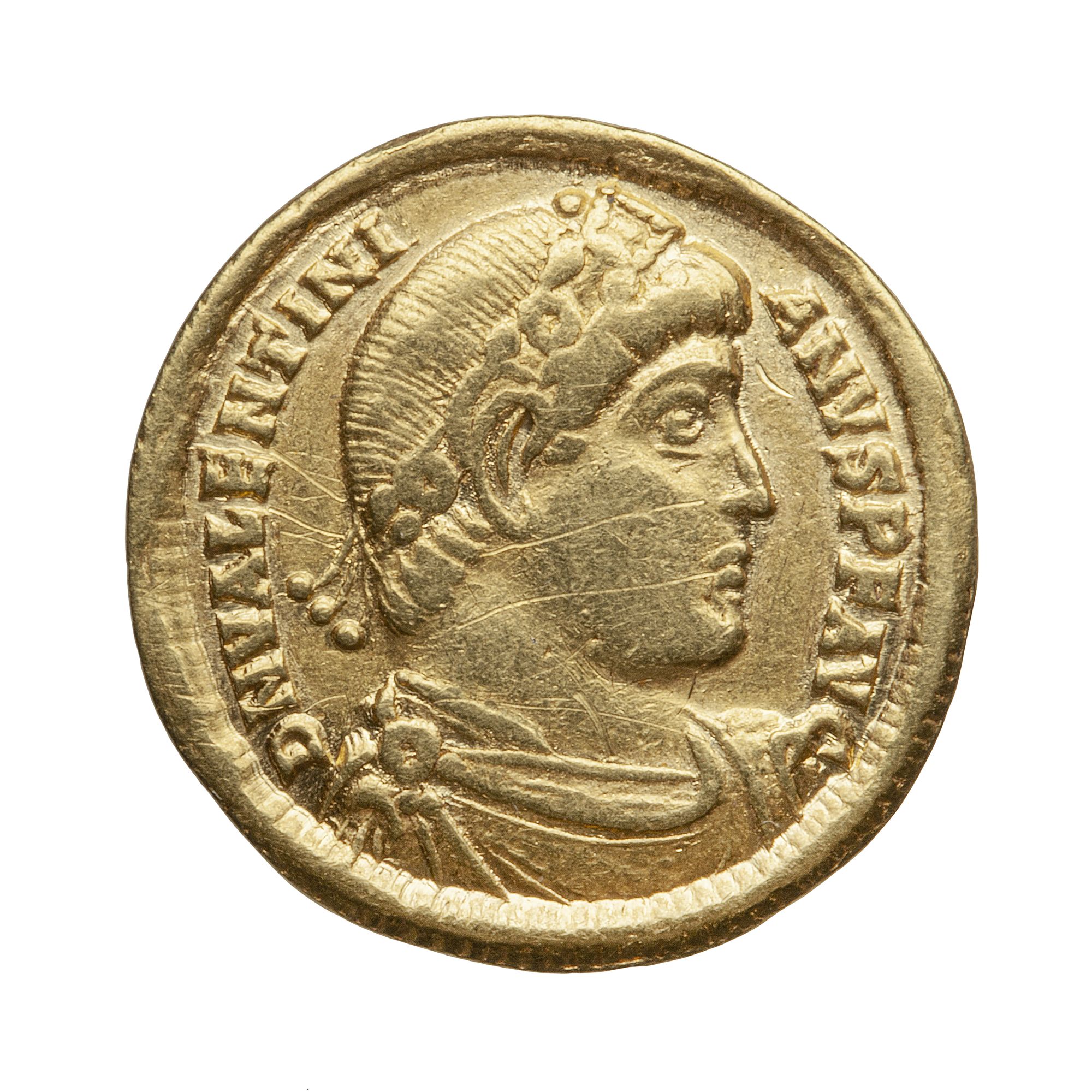 Busto dell’imperatore di profilo, rivolto a destra, con diadema sul capo, capelli corti e lisci e spalle rivestite dalla toga.; D N VALENTINIANUS P F AUG (Il nostro signore Valentiniano, pio, felice, Augusto)