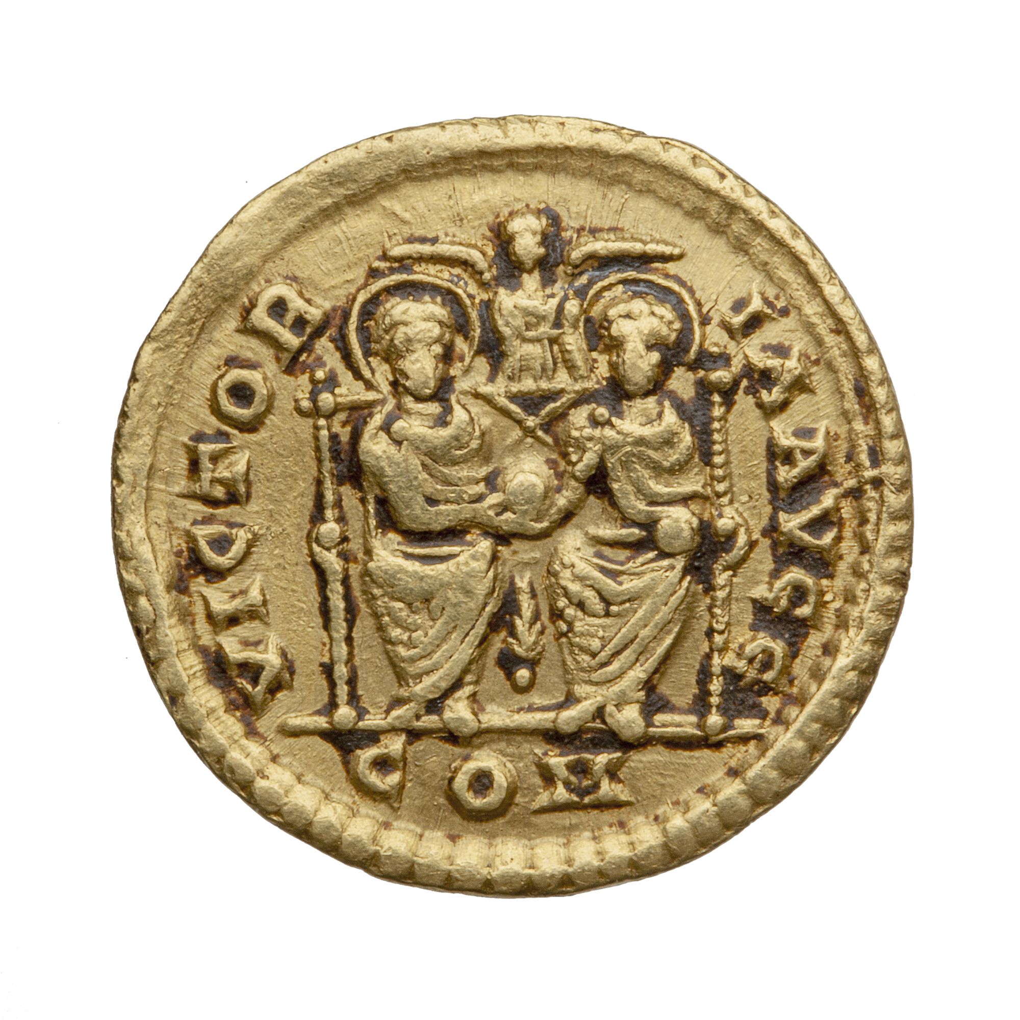 Solido con testa di Teodosio I / Due imperatori in trono con vittoria