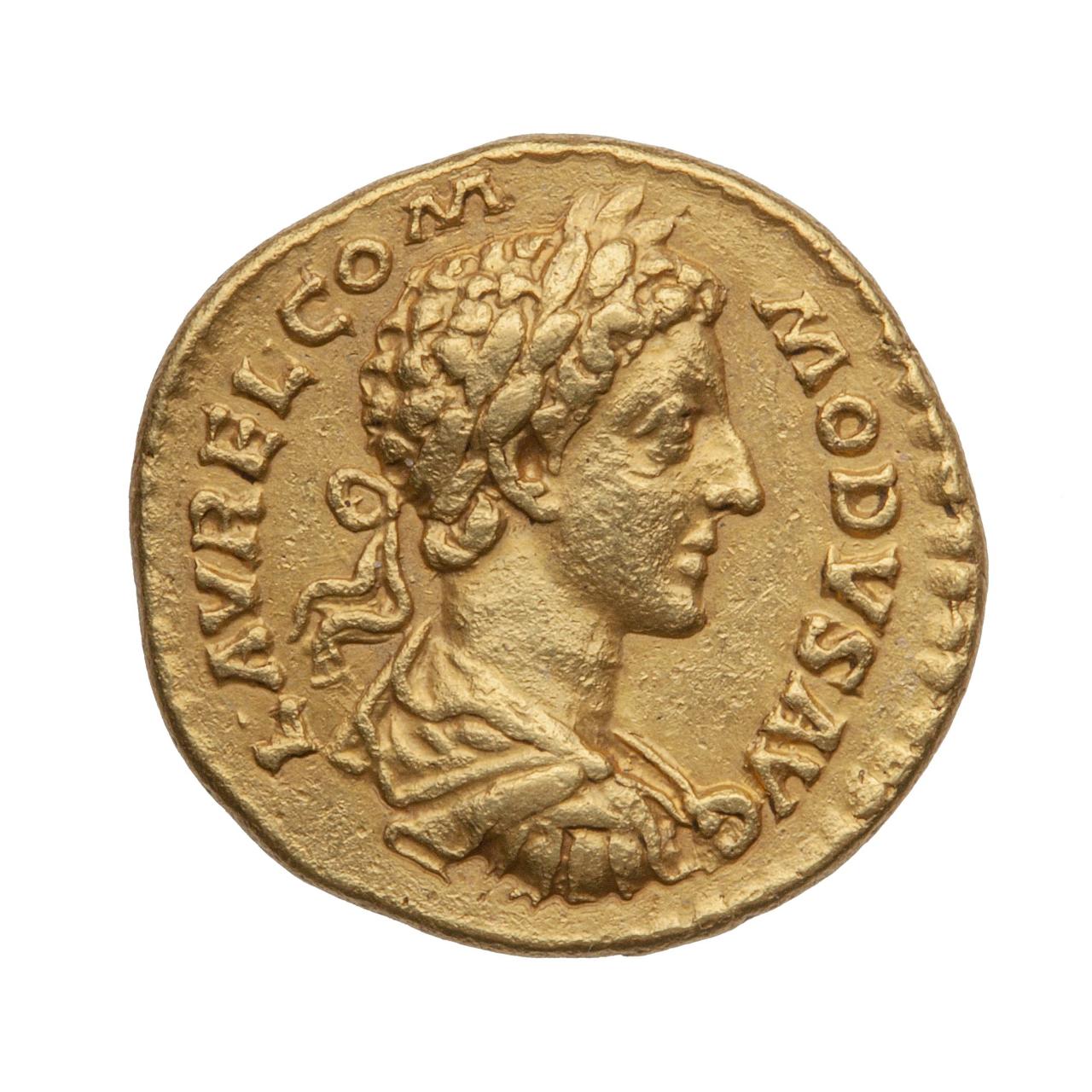 Busto dell’imperatore di profilo, rivolto a destra, con corona d’alloro sul capo, capelli corti ricci, e con le spalle coperte dalla corazza.; L AUREL COMMODUS AUG (Lucio Aurelio Commodo Augusto)