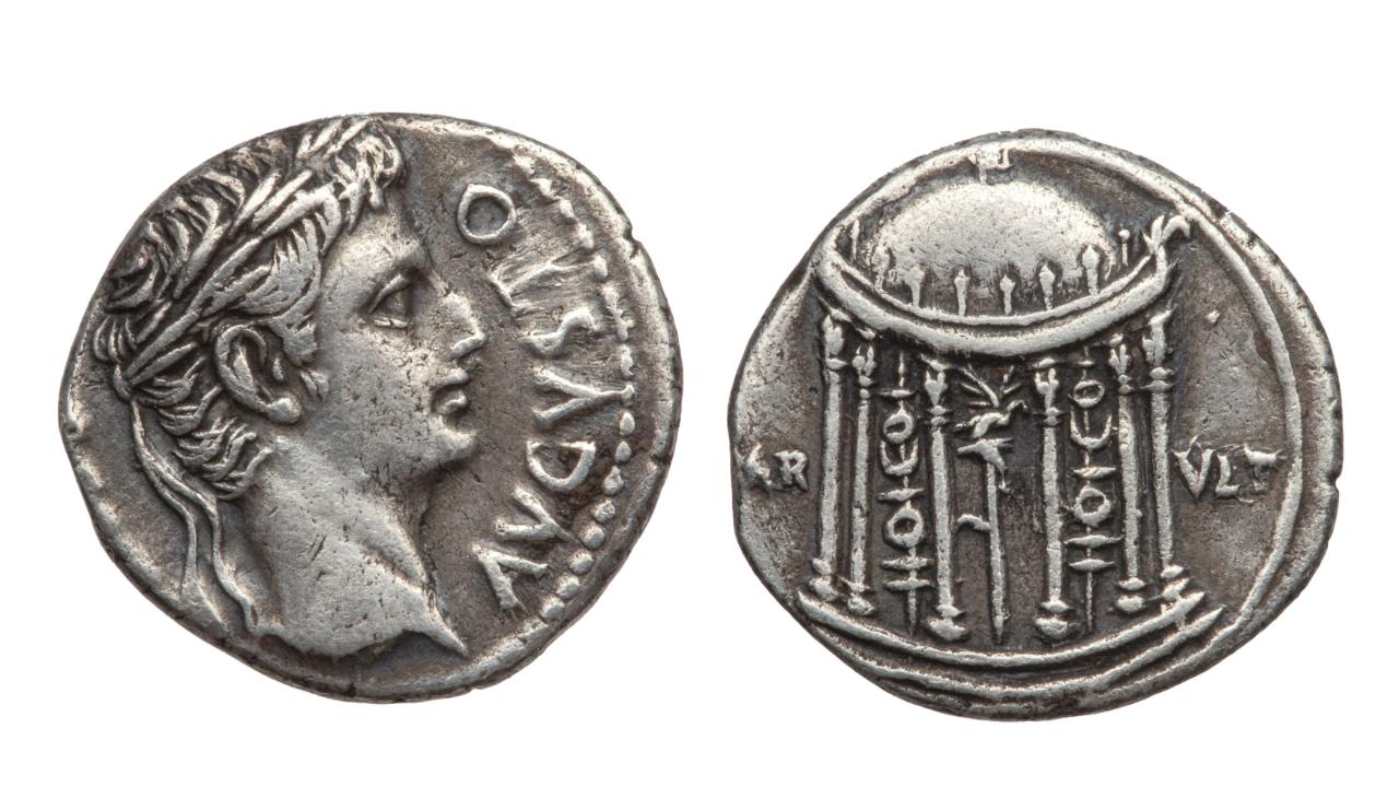 Raffigurazione di un edificio templare, all’interno del quale si distinguono un’aquila e stendardi. Dalla legenda, scritta lati della raffigurazione, si deduce che si tratta del tempio di Marte Ultore, il quale si trovava a Roma proprio nel foro di Augusto.;