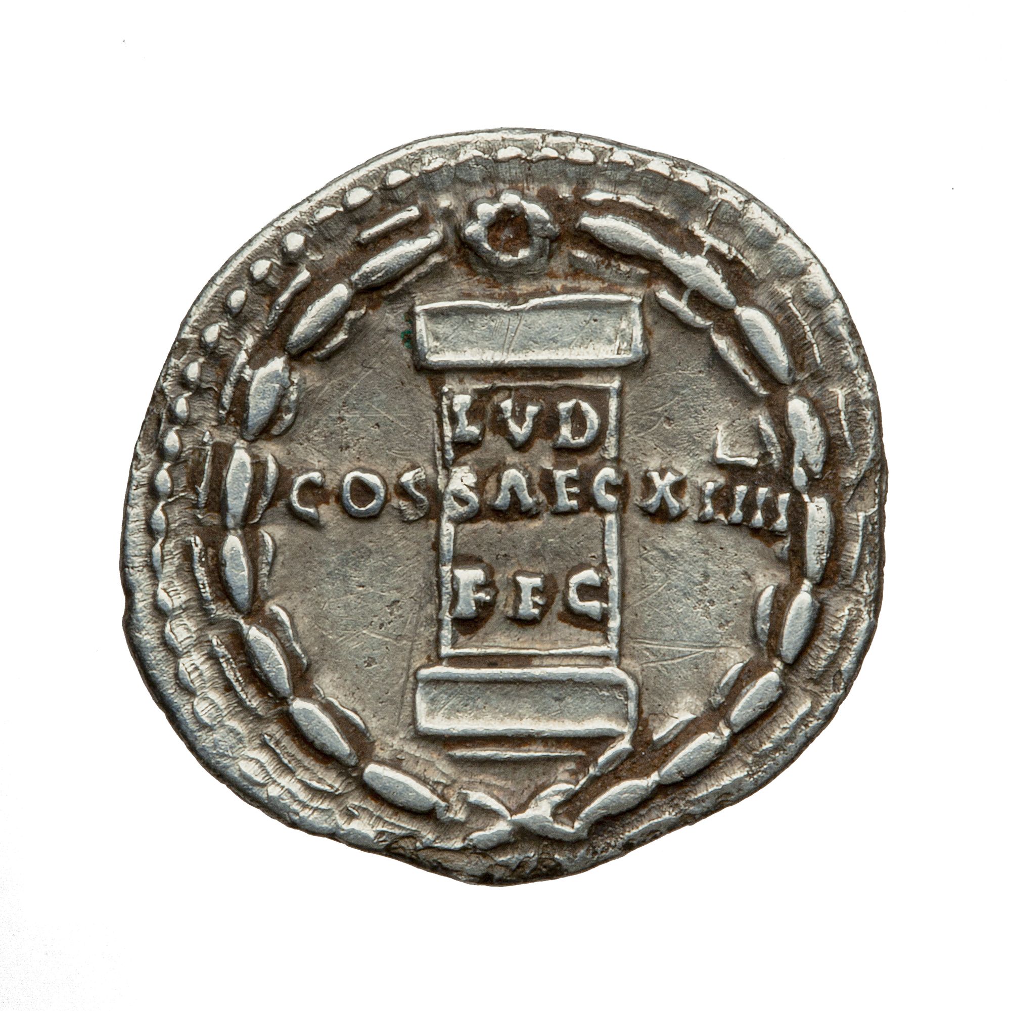 LUD SAEC FEC (organizzò i Giochi Secolari); ai lati, nel campo, invece: COS XIIII (console per la quattordicesima volta)