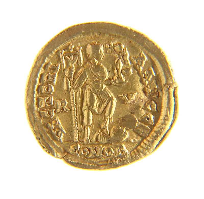 Imperatore a destra con labaro e Vittoria che calpesta un prigioniero; VICTORI AAVGGG, nel campo R V, in esergo CONOB