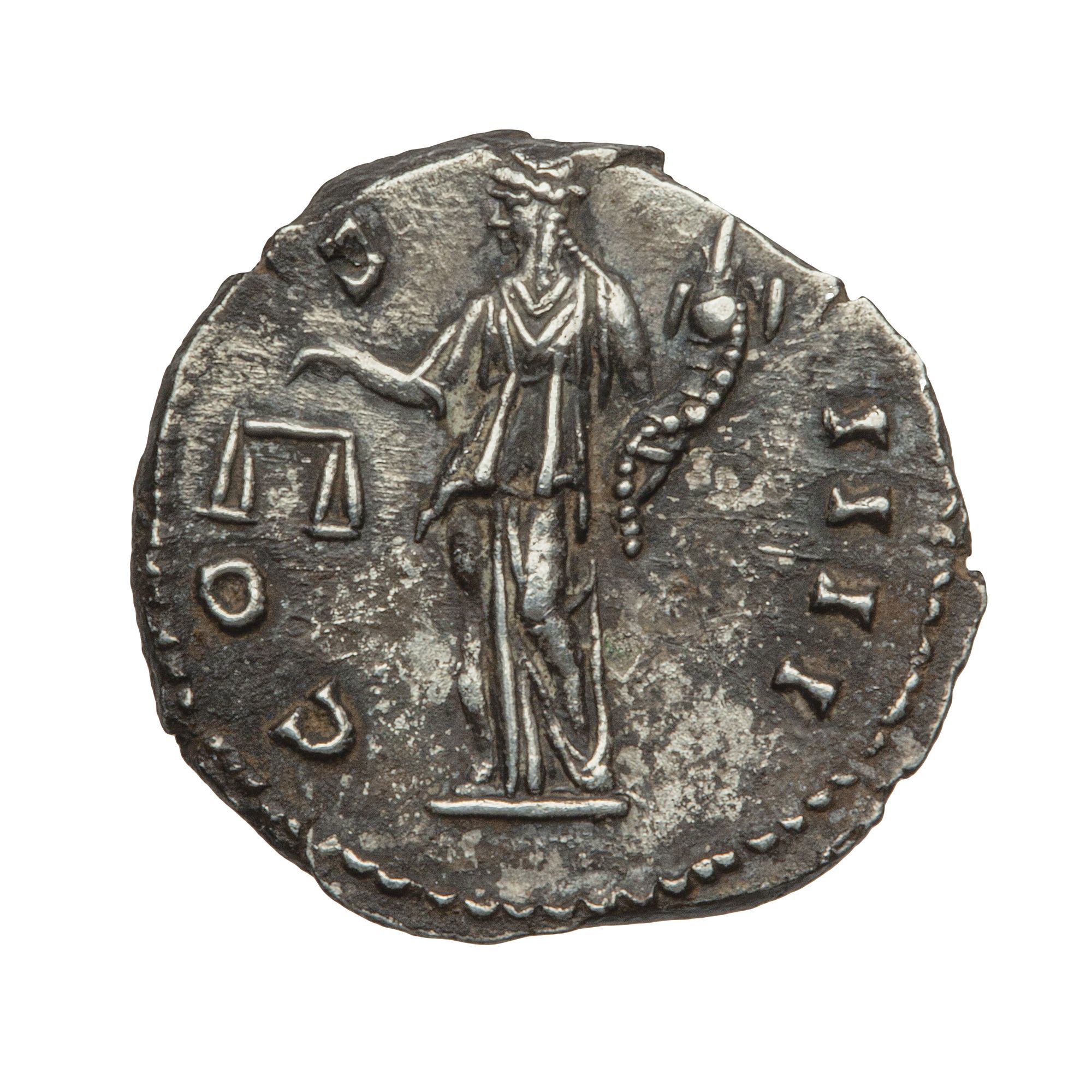 Figura femminile stante e frontale, con capo rivolto verso sinistra, che in una mano regge una cornucopia e nell’altra una bilancia.; COS IIII (console per la quarta volta)
