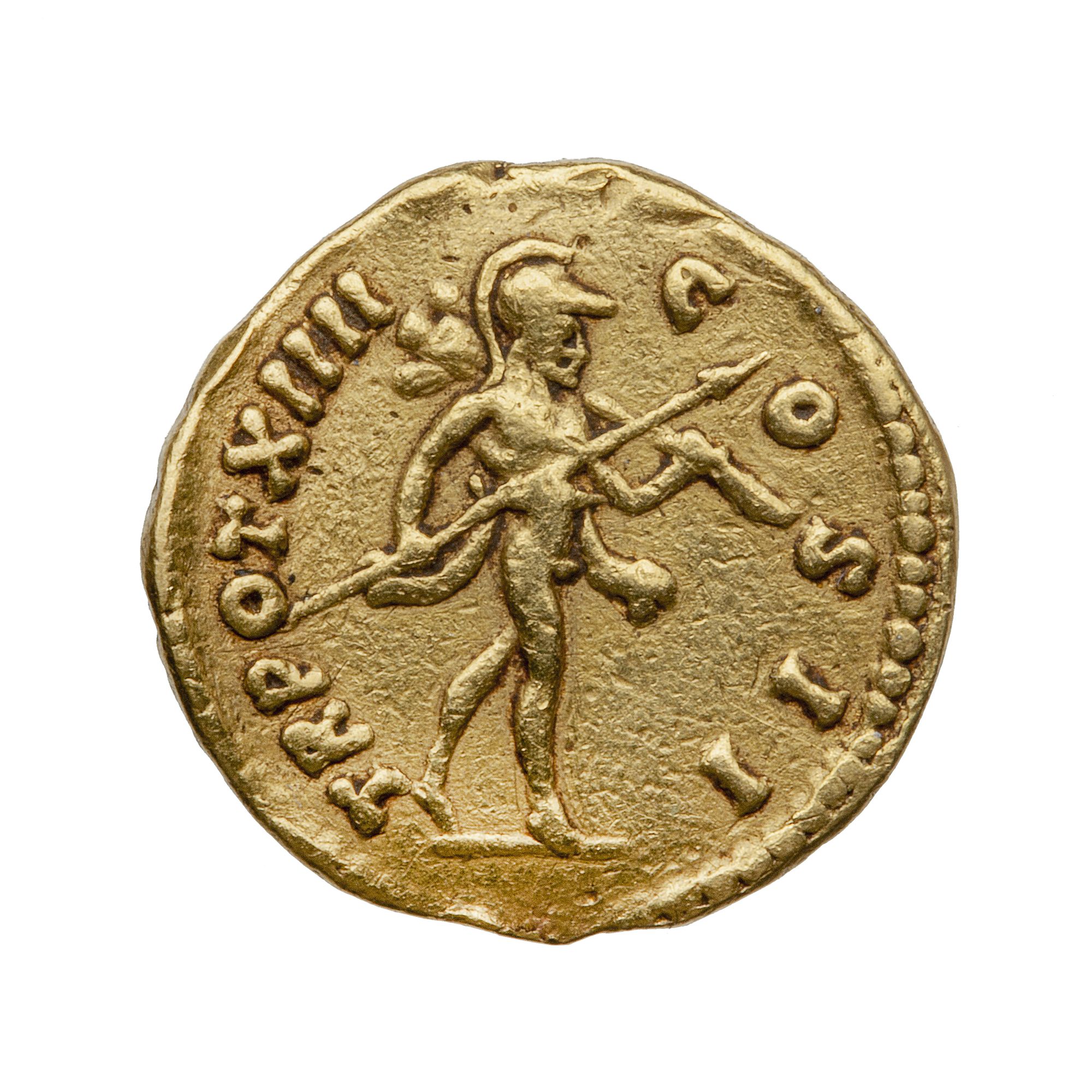 Figura di Marte, incedente verso destra, che in una mano tiene una lancia, nell’altra, poggiandolo sulla spalla, un trofeo.; TR POT XIIII COS II (tribuno della plebe per la quattordicesima volta, console per la seconda volta)