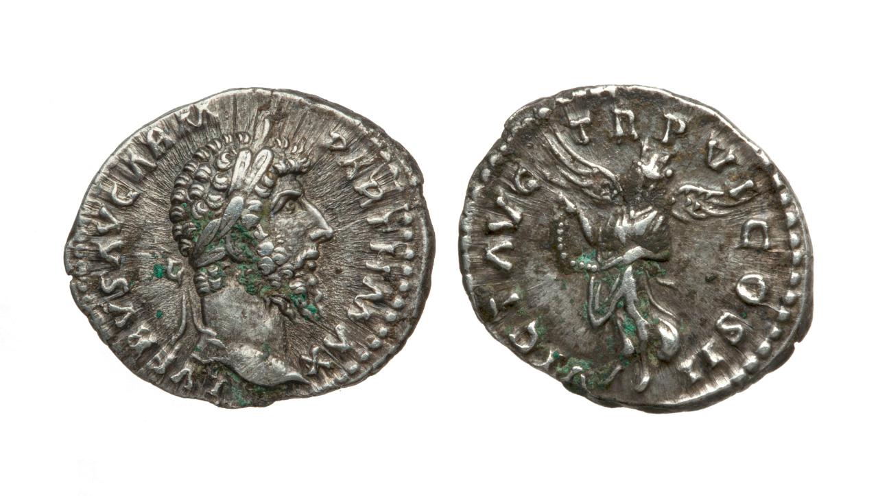 Testa dell’imperatore di profilo, rivolto a destra, con corona d’alloro sul capo, capelli corti ricci, caratterizzato da una lunga barba riccioluta e dal naso aquilino.; L VERUS AUG ARM PARTH MAX (Lucio Vero Augusto, vincitore massimo degli Armeni e dei Parti)