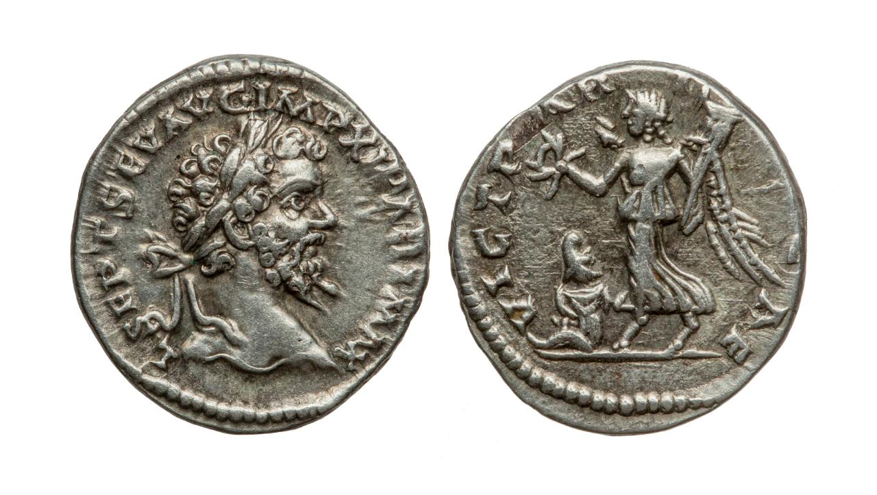 Testa dell’imperatore di profilo, rivolto a destra, con corona d’alloro sul capo, capelli corti ricci, caratterizzato da una lunga barba riccioluta e dal naso dritto.; L SEPT SEV AUG IMP XI PART MAX (Lucio Settimio Severo Augusto, dotato di imperium per l’undicesima volta, massimo vincitore dei Parti)