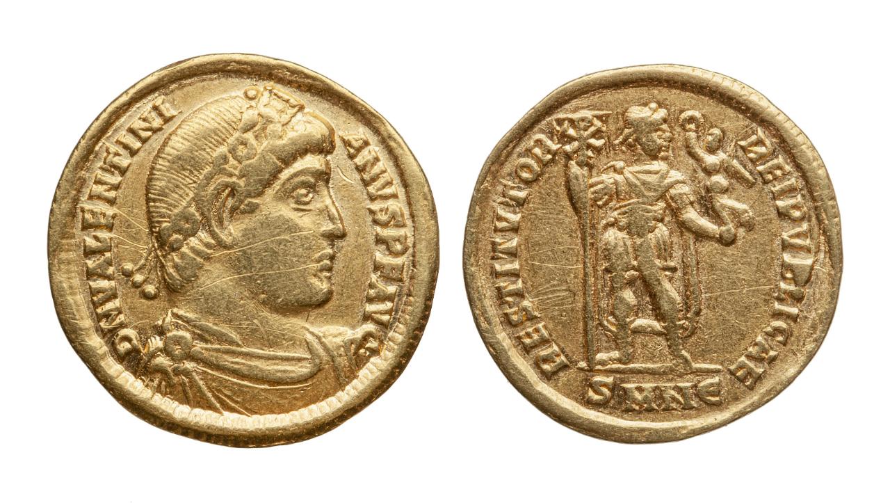 Busto dell’imperatore di profilo, rivolto a destra, con diadema sul capo, capelli corti e lisci e spalle rivestite dalla toga.; D N VALENTINIANUS P F AUG (Il nostro signore Valentiniano, pio, felice, Augusto)