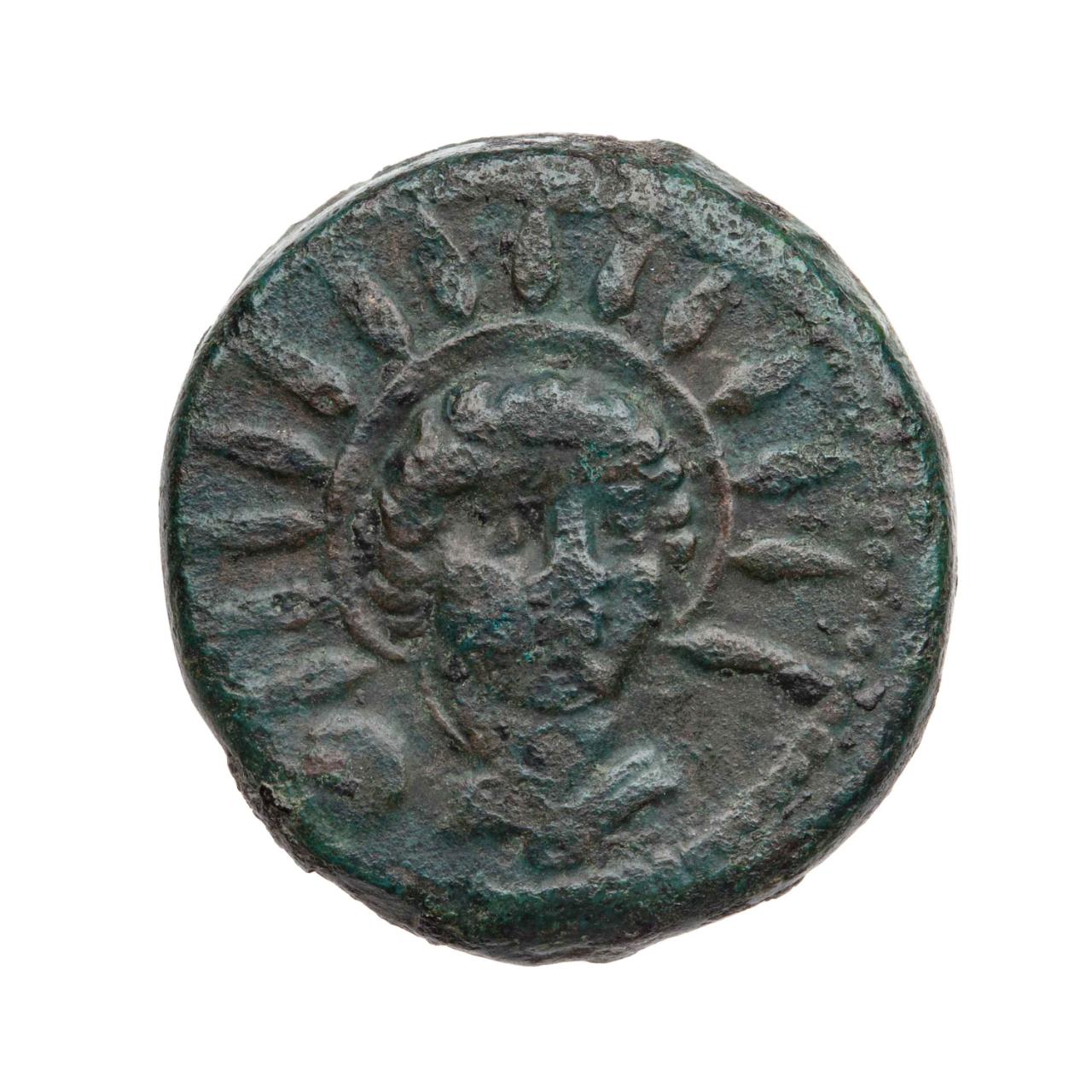 Busto frontale drappeggiato del Sole. A sinistra: un globetto.