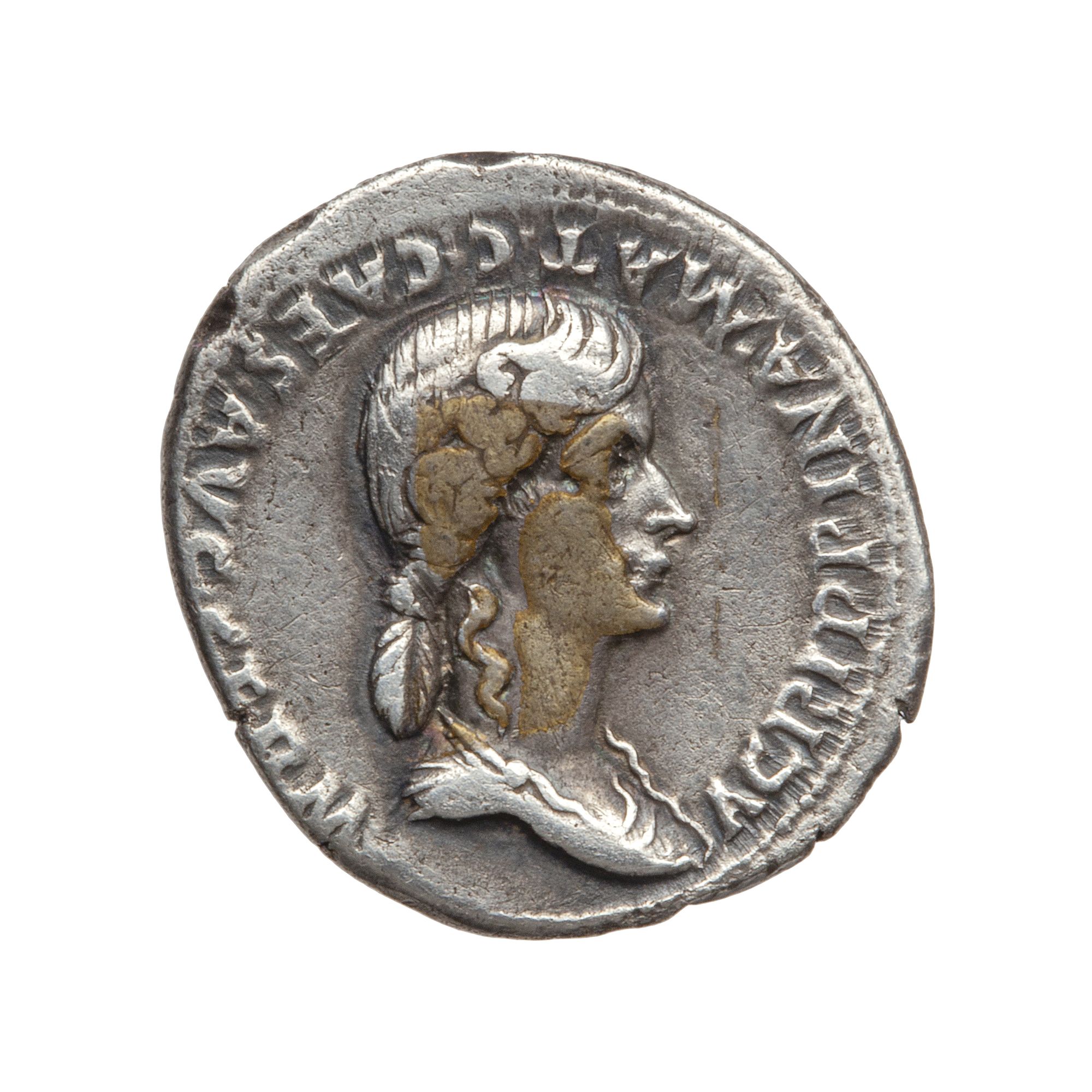 Ritratto di Agrippina, madre di Caligola: il volto di profilo è ritratto verso destra.; in senso antiorario: AGRIPPINA MAT C CAES AUG GERM (Agrippina, madre di Gaio Cesare Augusto Germanico)