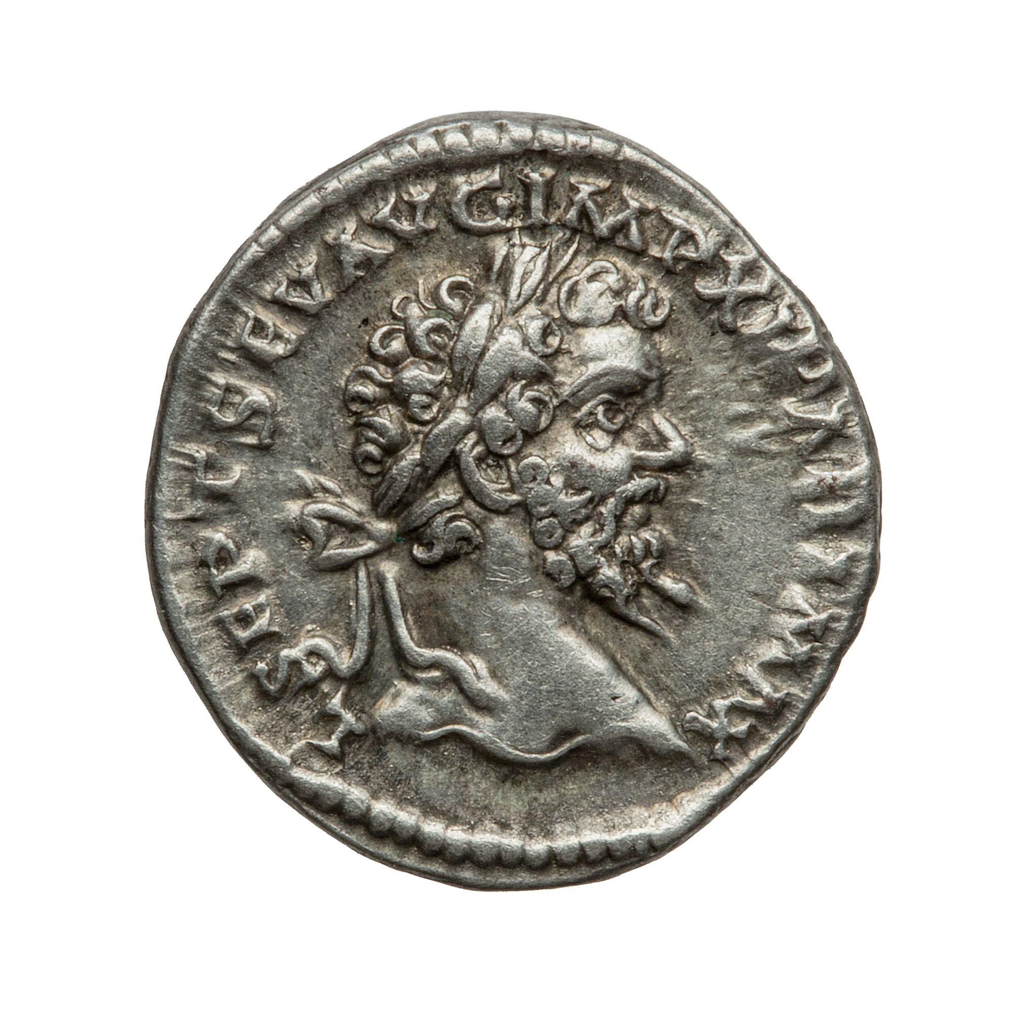 Testa dell’imperatore di profilo, rivolto a destra, con corona d’alloro sul capo, capelli corti ricci, caratterizzato da una lunga barba riccioluta e dal naso dritto.; L SEPT SEV AUG IMP XI PART MAX (Lucio Settimio Severo Augusto, dotato di imperium per l’undicesima volta, massimo vincitore dei Parti)