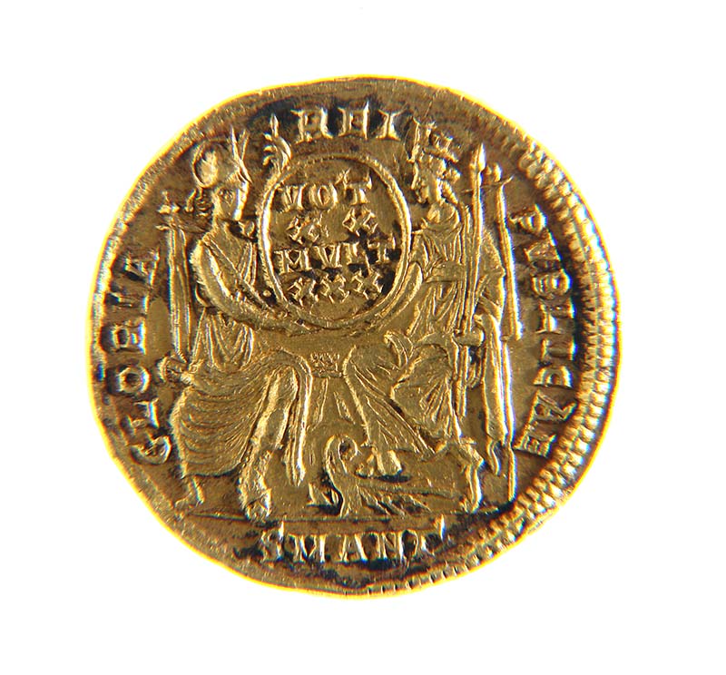 Raffigurazione di Roma e Costantinopoli sullo scudo; GLORIA REI PVBLICAE, al centro VOT / XX / MULT / XXX, in esergo SMANT